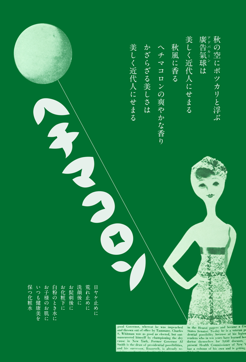 戦い疲れたら、見上げてごらん。ほらね。ノー天気で気まぐれな秋の空は、心を空っぽにしてくれる。後はハッピーな想いで満たせばいい。星の瞬きに癒やされてもいい、月に慰められてもいい、元気なアドバルーンに励まされてもいい・・・。この懐かしい誌面には「秋の空にポッカリ浮かぶ廣告氣球(アドバルーン)は・・・秋風に香るヘチマコロンの爽やかな香り かざらざる美しさは 美しく近代人にせまる」と。今を生きる、かざらないあなたに寄り添うヘチマコロンがあります。あなたとお肌が、ずっとずっと美しく元気でありますように。さあ、明日もがんばろう!